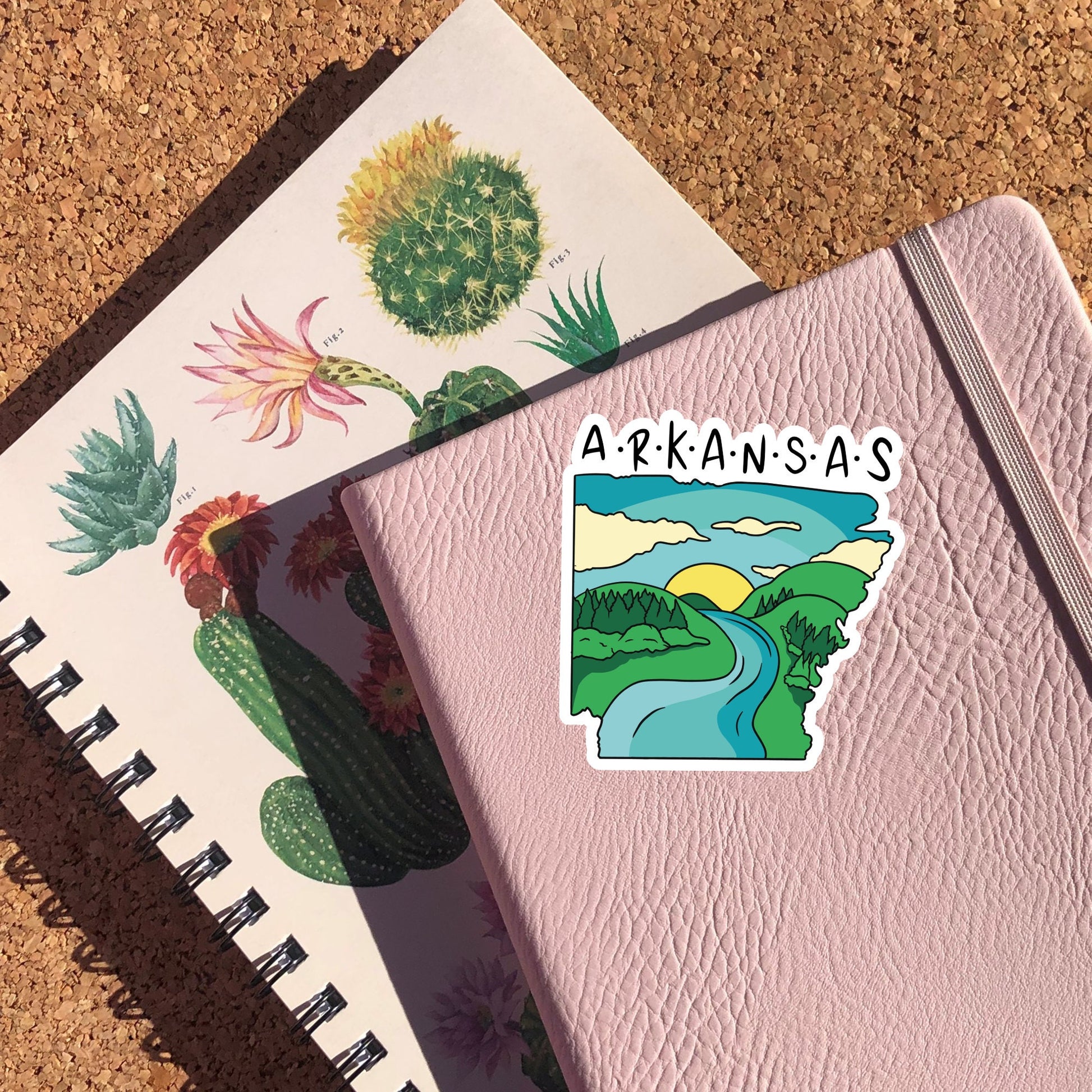 Display your Arkansas pride with our Arkansas-shaped sticker. This unique design showcases the outline of the Natural State, symbolizing its scenic beauty, outdoor adventures, and rich history. Stick it on your car, water bottle, or any surface to represent your love for Arkansas.