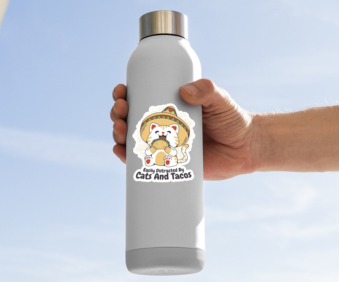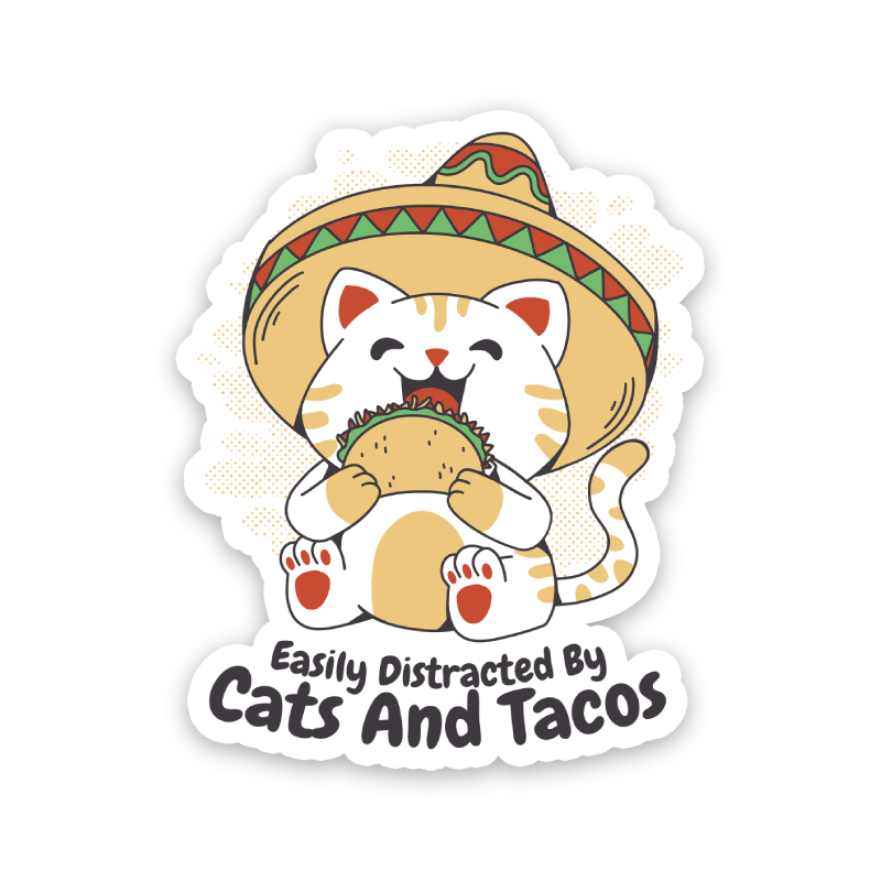 Celebrate your love for both feline friends and delicious tacos with our 'Easily Distracted By Cats And Tacos' sticker. This sticker captures the essence of your passions and your tendency to get sidetracked by these delightful distractions. Stick it on your belongings and let others know what easily captures your attention.