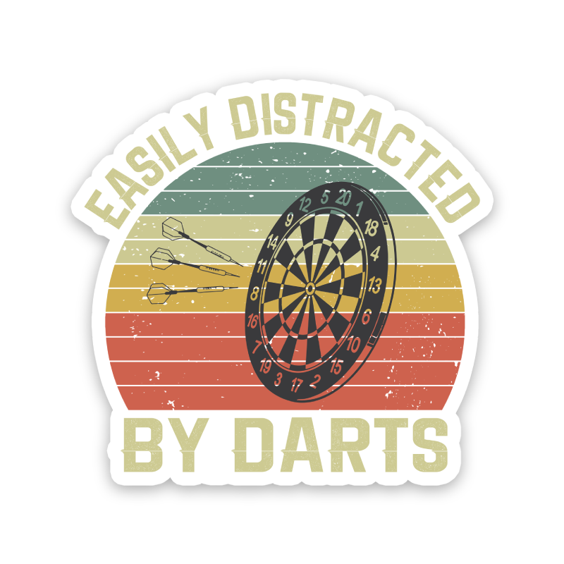 Hit the bullseye with our "Easily Distracted By Darts" sticker. This design represents the precision and focus of darts, symbolizing the distraction it brings to enthusiasts. Stick it on your dartboard, man cave wall, or any surface to showcase your love for this competitive and skillful game.