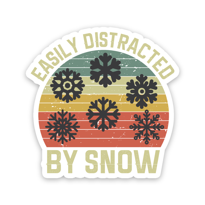 Enjoy a fun wintery design with this Easily Distracted By Snow Sticker, featuring a colorful seasonal image. Perfect to adorn your laptop, water bottle, or any other smooth surface to show your love for the winter season.