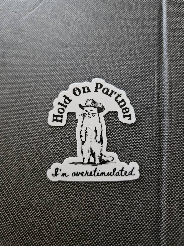 This Hold On Partner I'm Overstimulated Sticker is perfect for laptops, notebooks, phones, tablets, mirrors, water bottles, tumblers, planners, journals, cars, and more