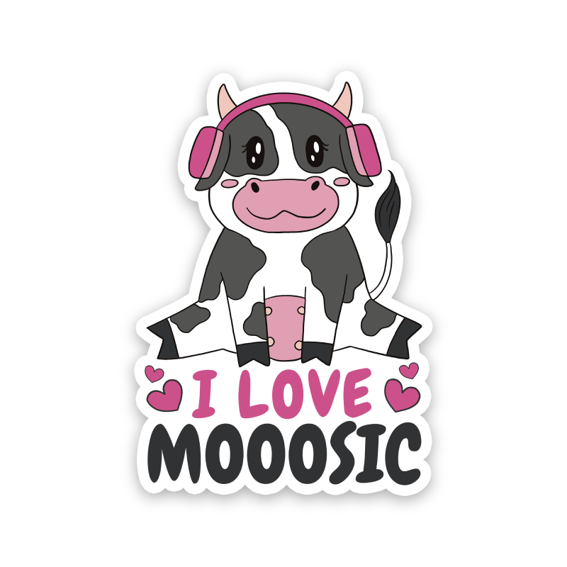 Declare your love for both cows and music with our 'I Love Mooosic' sticker. This playful twist on the word 'music' combines the charm of farm life with the joy of melodies. Stick it on your belongings and let others know that you appreciate the harmony found in both nature and music.