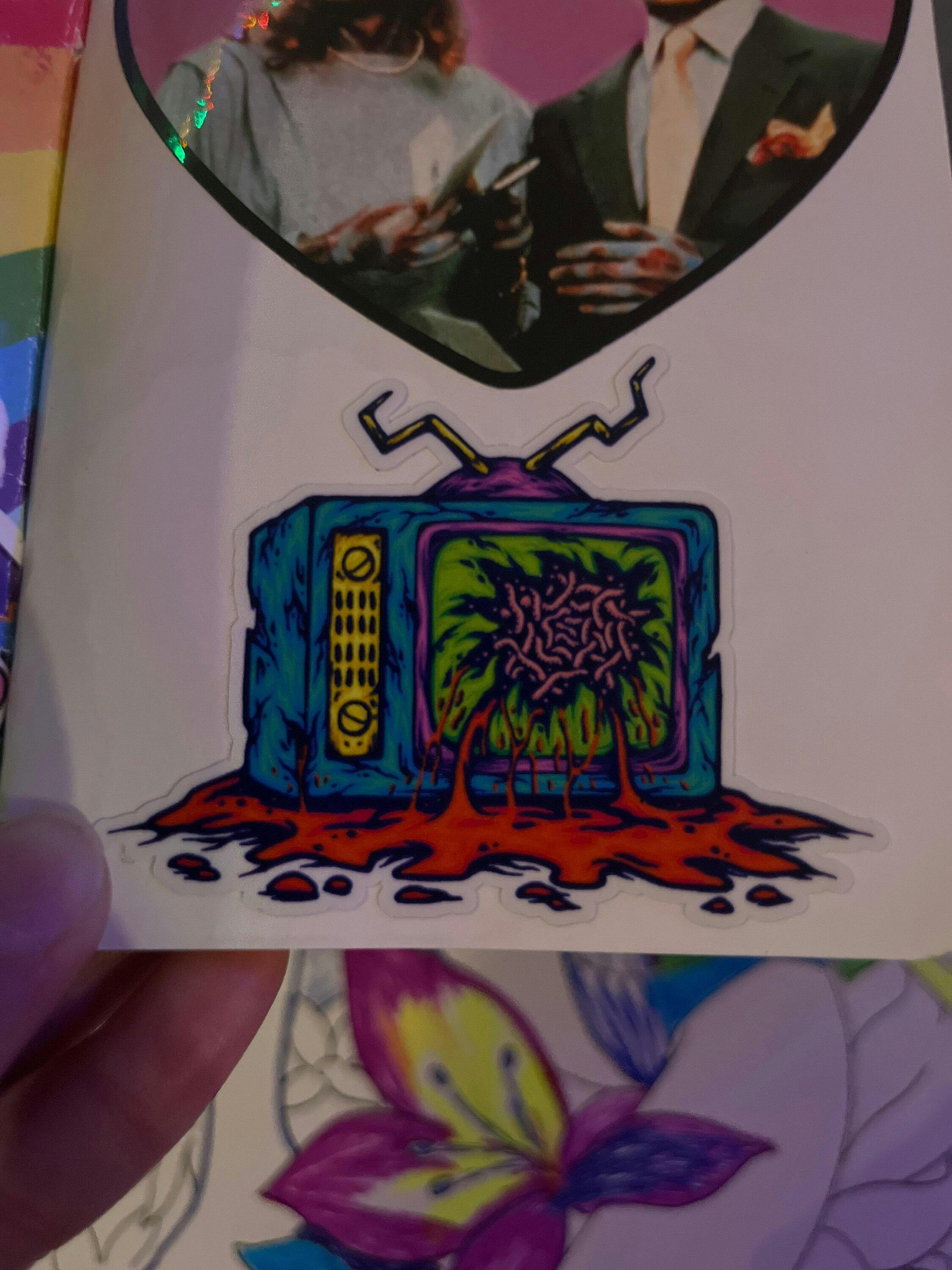 Add some gory fun to your sticker collection with our TV Zombie Head Gore Sticker. This delightfully gruesome design showcases a zombie with a television for a head, dripping with blood and bringing a macabre twist to your favorite devices.